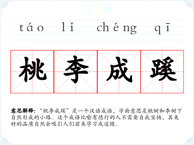 “桃李成蹊”是一个汉语成语,字面意思是桃树和李树下自然形成的小路。这个成语比喻有德行的人不需要自我宣扬,其美好的品质自然会吸引人们前来学*或追随。