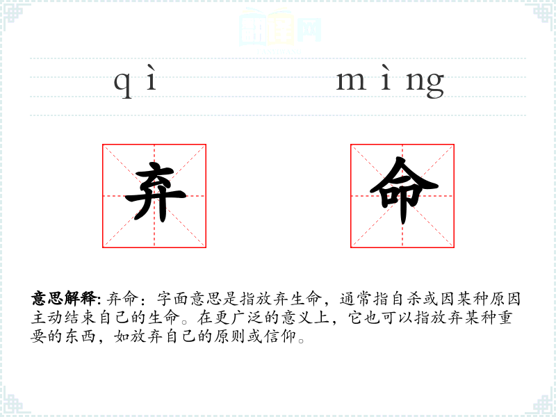 弃命:字面意思是指放弃生命,通常指自杀或因某种原因主动结束自己的生命。在更广泛的意义上,它也可以指放弃某种重要的东西,如放弃自己的原则或信仰。