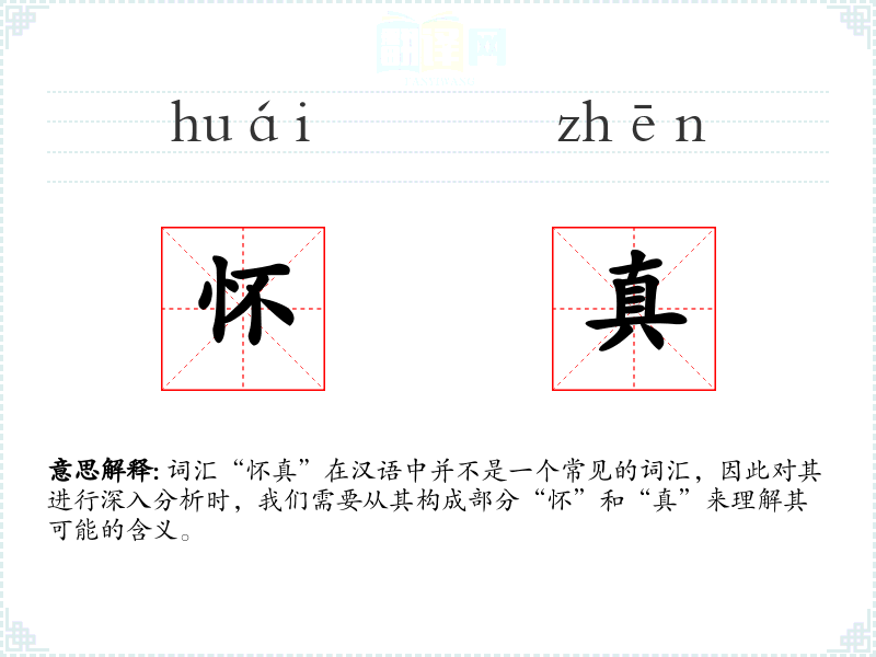 词汇“怀真”在汉语中并不是一个常见的词汇,因此对其进行深入分析时,我们需要从其构成部分“怀”和“真”来理解其可能的含义。