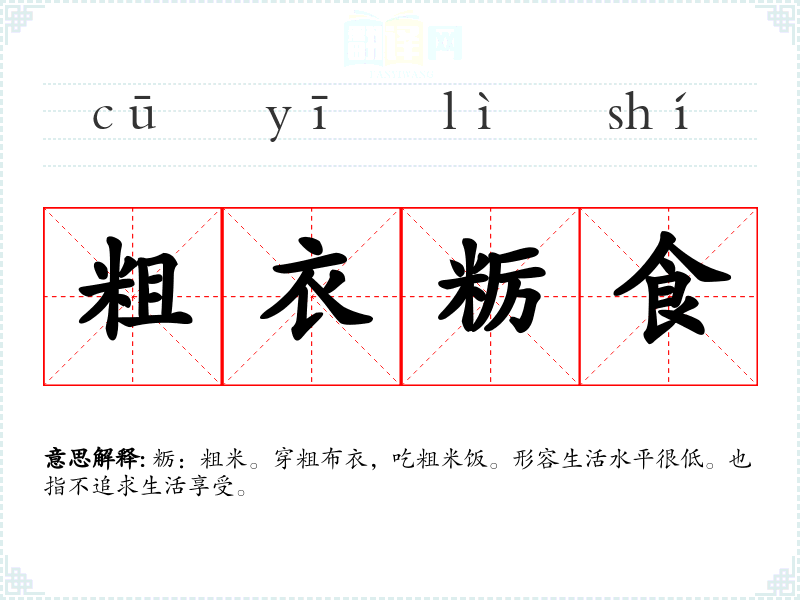 粝:粗米。穿粗布衣,吃粗米饭。形容生活水平很低。也指不追求生活享受。