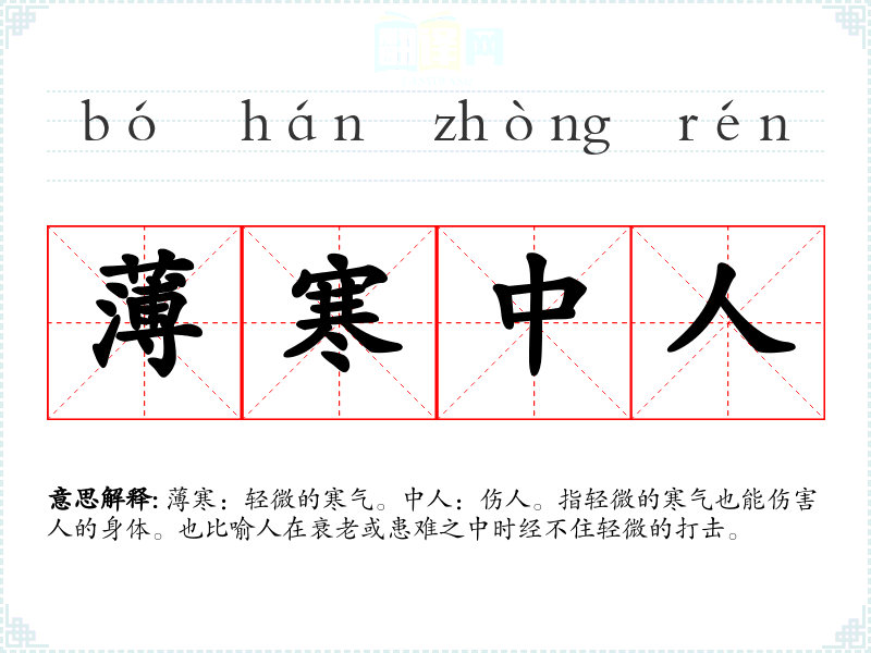 薄寒:轻微的寒气。中人:伤人。指轻微的寒气也能伤害人的身体。也比喻人在衰老或患难之中时经不住轻微的打击。