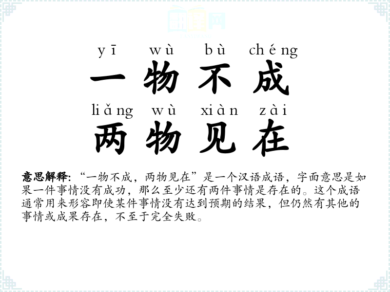 “一物不成,两物见在”是一个汉语成语,字面意思是如果一件事情没有成功,那么至少还有两件事情是存在的。这个成语通常用来形容即使某件事情没有达到预期的结果,但仍然有其他的事情或成果存在,不至于完全失败。