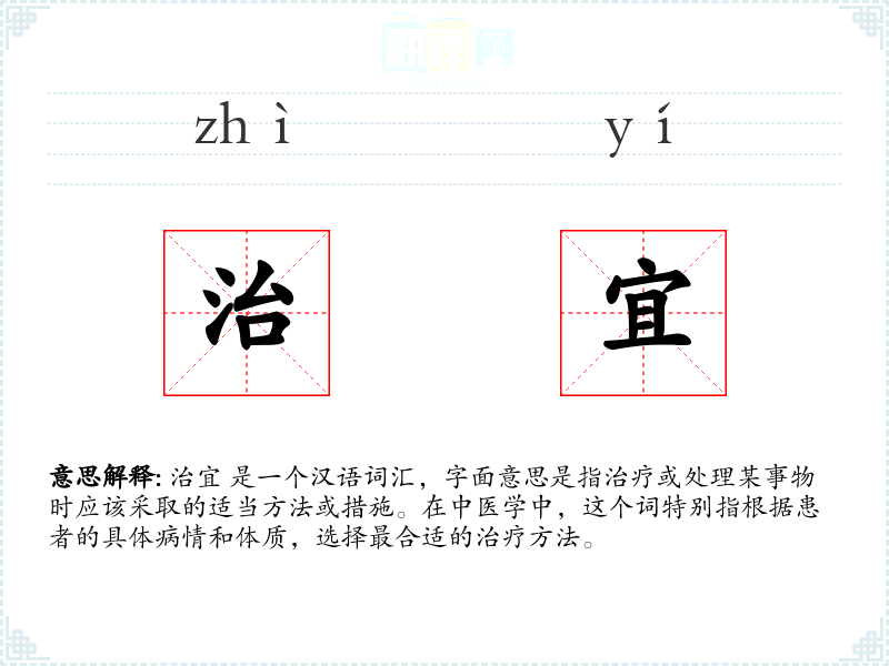 治宜 是一个汉语词汇,字面意思是指治疗或处理某事物时应该采取的适当方法或措施。在中医学中,这个词特别指根据患者的具体病情和体质,选择最合适的治疗方法。