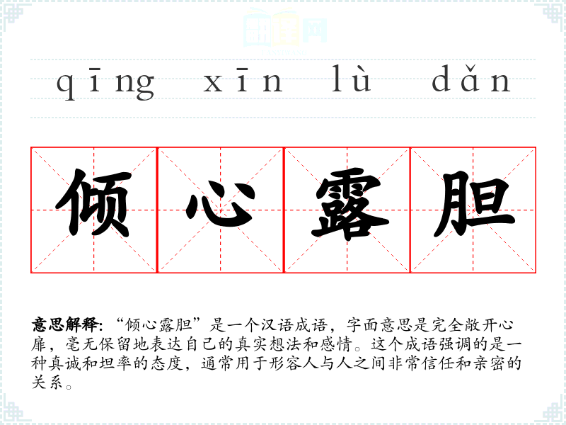 “倾心露胆”是一个汉语成语,字面意思是完全敞开心扉,毫无保留地表达自己的真实想法和感情。这个成语强调的是一种真诚和坦率的态度,通常用于形容人与人之间非常信任和亲密的关系。
