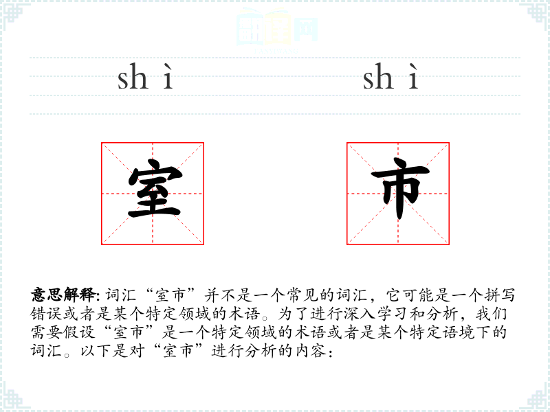 由于“室市”不是一个标准词汇,我们无法给出确切的基本定义。如果它是一个特定领域的术语,那么它的定义将取决于该领域的专业知识。