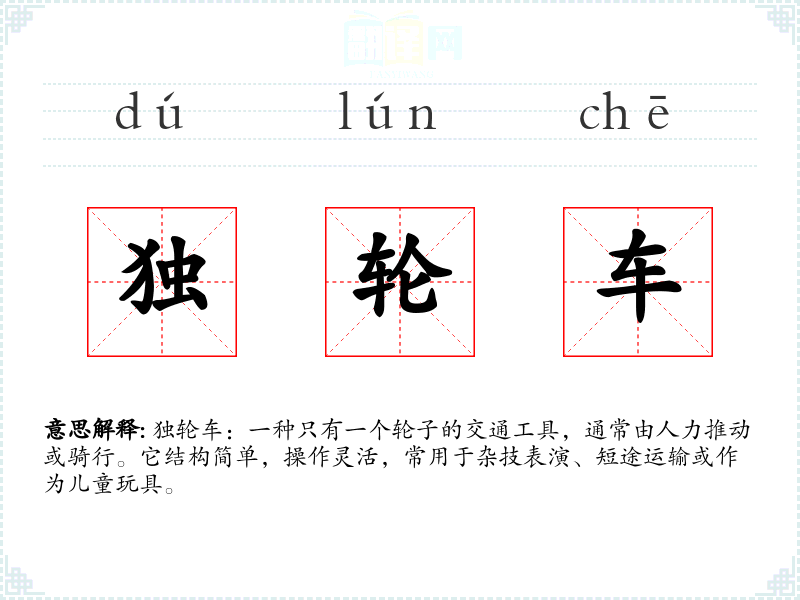 - 反义词:双轮车、三轮车、四轮车(这些词汇指代有两个或更多**的交通工具)