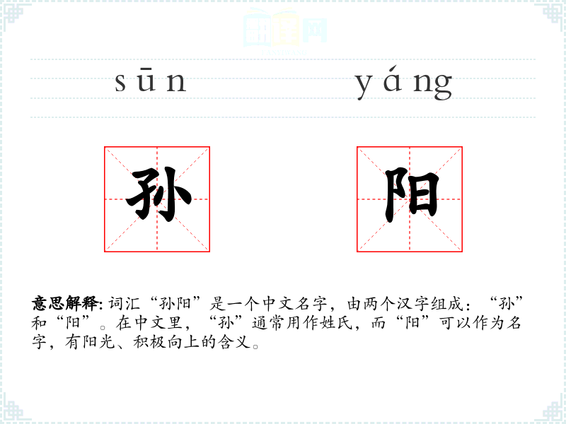 词汇“孙阳”是一个中文名字,由两个汉字组成:“孙”和“阳”。在中文里,“孙”通常用作姓氏,而“阳”可以作为名字,有阳光、积极向上的含义。