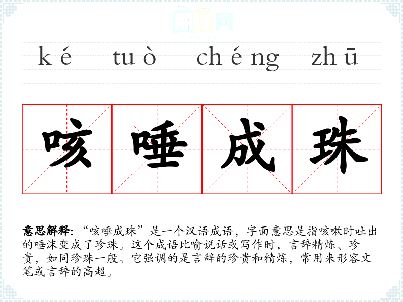 “咳唾成珠”是一个汉语成语,字面意思是指咳嗽时吐出的唾沫变成了珍珠。这个成语比喻说话或写作时,言辞精炼、珍贵,如同珍珠一般。它强调的是言辞的珍贵和精炼,常用来形容文笔或言辞的高超。