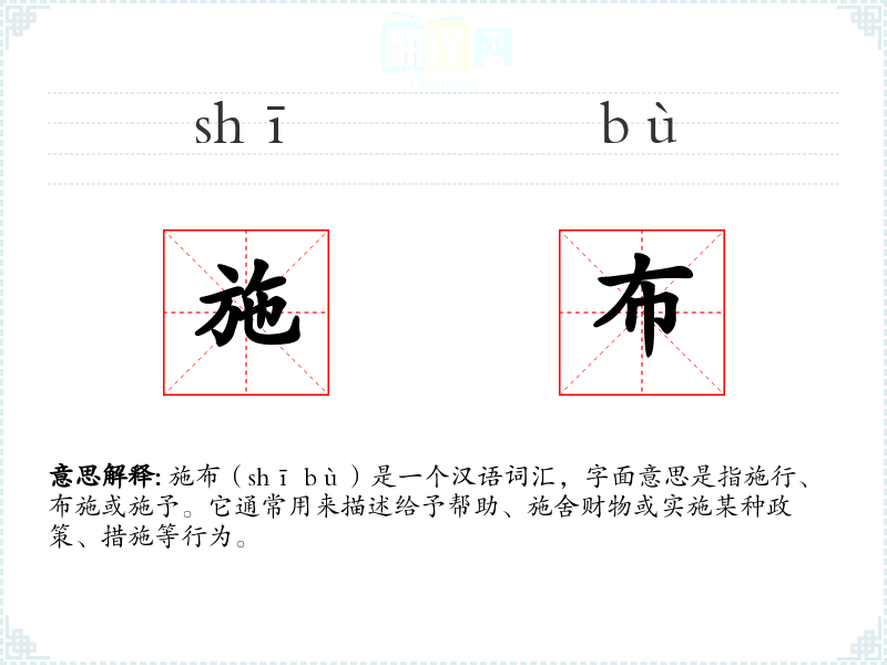 施布(shī bù)是一个汉语词汇,字面意思是指施行、布施或施予。它通常用来描述给予帮助、施舍财物或实施某种政策、措施等行为。