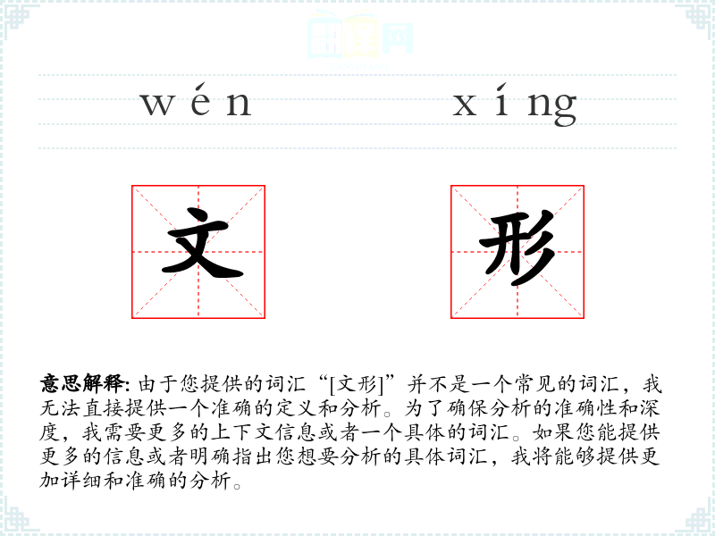 由于您提供的词汇“[文形]”并不是一个常见的词汇,我无法直接提供一个准确的定义和分析。为了确保分析的准确性和深度,我需要更多的上下文信息或者一个具体的词汇。如果您能提供更多的信息或者明确指出您想要分析的具体词汇,我将能够提供更加详细和准确的分析。