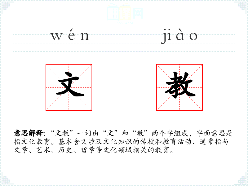 “文教”一词由“文”和“教”两个字组成,字面意思是指文化教育。基本含义涉及文化知识的传授和教育活动,通常指与文学、艺术、历史、哲学等文化领域相关的教育。