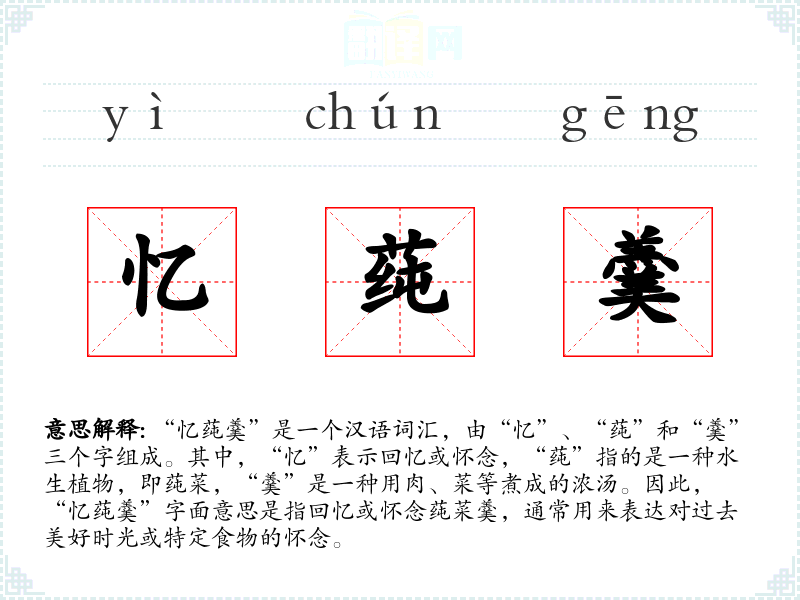 “忆莼羹”是一个汉语词汇,由“忆”、“莼”和“羹”三个字组成。其中,“忆”表示回忆或怀念,“莼”指的是一种水生植物,即莼菜,“羹”是一种用肉、菜等煮成的浓汤。因此,“忆莼羹”字面意思是指回忆或怀念莼菜羹,通常用来表达对过去美好时光或特定食物的怀念。