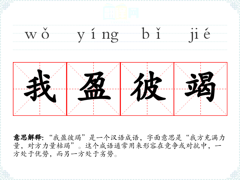 “我盈彼竭”是一个汉语成语,字面意思是“我方充满力量,对方力量枯竭”。这个成语通常用来形容在竞争或对抗中,一方处于优势,而另一方处于劣势。