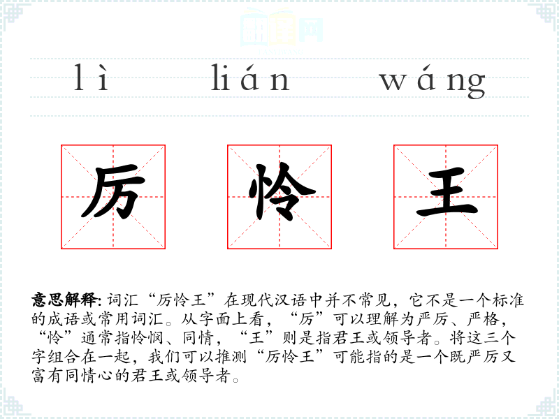 - 由于“厉怜王”不是一个常用词汇,它在文学、口语或专业领域中的使用非常有限。如果出现在文学作品中,可能是用来形容一个复杂的、具有多面性的君王形象。
