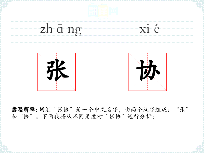 词汇“张协”是一个中文名字,由两个汉字组成:“张”和“协”。下面我将从不同角度对“张协”进行分析: