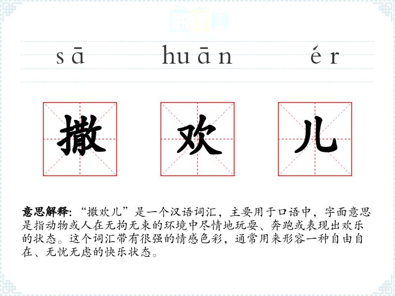 “撒欢儿”是一个汉语词汇,主要用于口语中,字面意思是指动物或人在无拘无束的环境中尽情地玩耍、奔跑或表现出欢乐的状态。这个词汇带有很强的情感色彩,通常用来形容一种自由自在、无忧无虑的快乐状态。