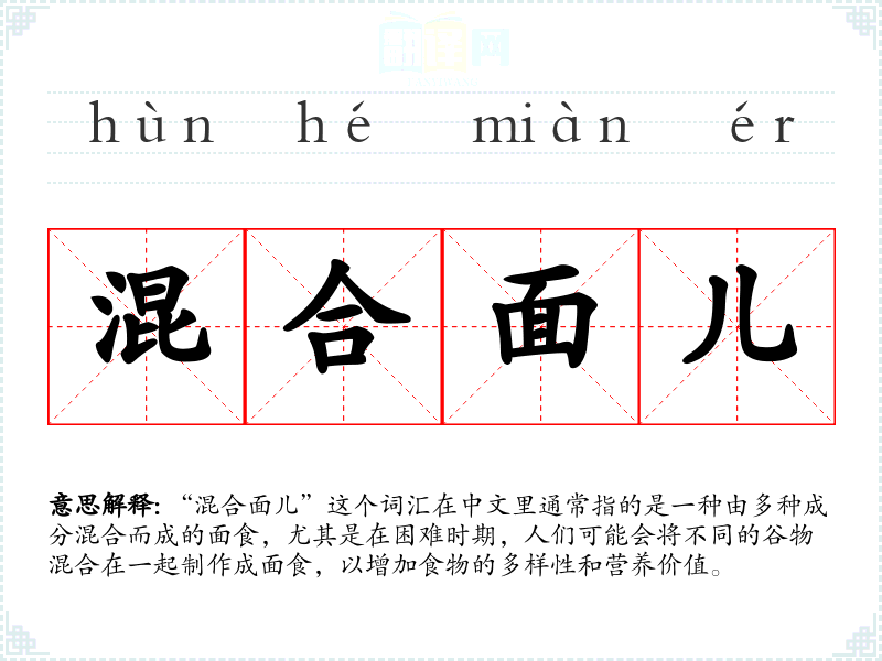 “混合面儿”这个词汇在中文里通常指的是一种由多种成分混合而成的面食,尤其是在困难时期,人们可能会将不同的谷物混合在一起制作成面食,以增加食物的多样性和营养价值。