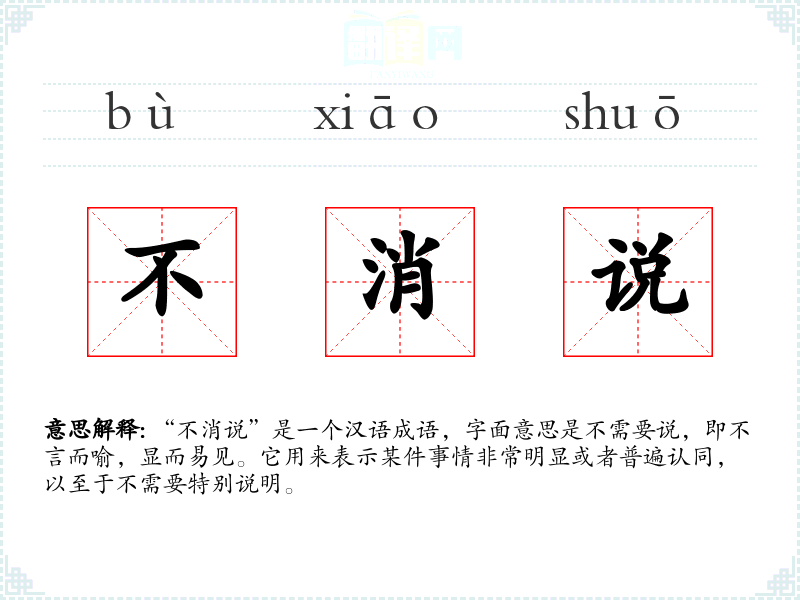 “不消说”源自古代汉语,其中“不消”意为不需要,“说”即说话或解释。随着时间的推移,这个短语被广泛接受并用于各种语境中,保持了其基本含义。