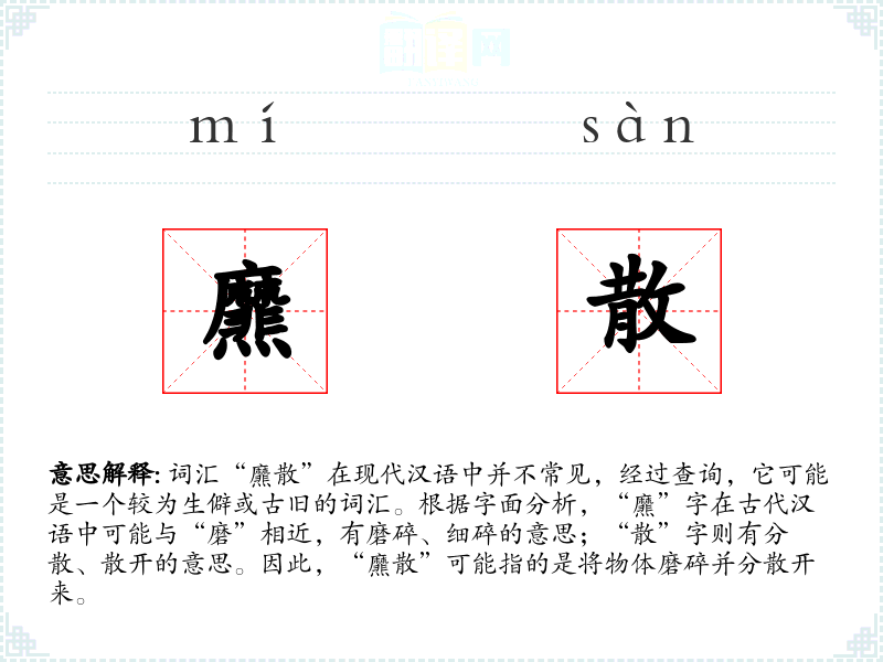 词汇“爢散”在现代汉语中并不常见,经过查询,它可能是一个较为生僻或古旧的词汇。根据字面分析,“爢”字在古代汉语中可能与“磨”相近,有磨碎、细碎的意思;“散”字则有分散、散开的意思。因此,“爢散”可能指的是将物体磨碎并分散开来。