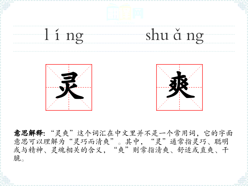 “灵爽”这个词汇在中文里并不是一个常用词,它的字面意思可以理解为“灵巧而清爽”。其中,“灵”通常指灵巧、聪明或与精神、灵魂相关的含义,“爽”则常指清爽、舒适或直爽、干脆。