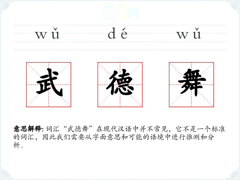 词汇“武德舞”在现代汉语中并不常见,它不是一个标准的词汇,因此我们需要从字面意思和可能的语境中进行推测和分析。