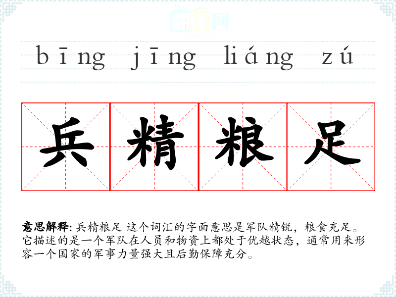 兵精粮足 这个词汇的字面意思是军队精锐,粮食充足。它描述的是一个军队在人员和物资上都处于优越状态,通常用来形容一个国家的军事力量强大且后勤保障充分。