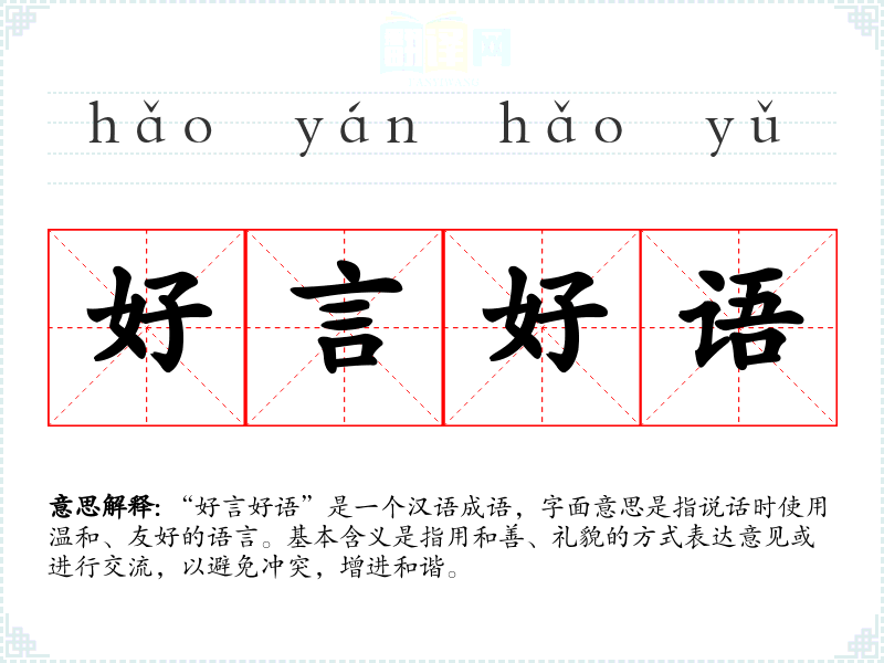 “好言好语”是一个汉语成语,字面意思是指说话时使用温和、友好的语言。基本含义是指用和善、礼貌的方式表达意见或进行交流,以避免冲突,增进和谐。