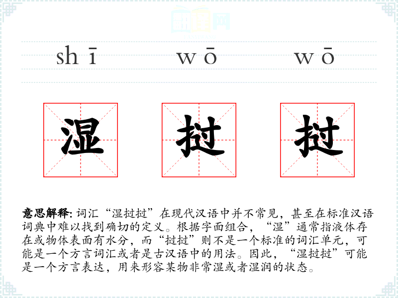 由于“湿挝挝”不是一个标准词汇,其词源和演变难以考证。可能是某个方言词汇的变体,或者是古汉语中的遗留用法。