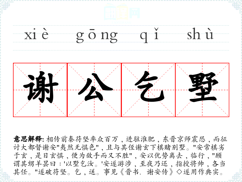 1.相传前秦苻坚率众百万﹐进驻淮肥﹐东晋京师震恐﹐而征讨大都督谢安"夷然无惧色"﹐且与其侄谢玄下棋赌别墅。"安常棋劣于玄﹐是日玄惧﹐便为敌手而又不胜"﹐安以优势离去﹐临行﹐"顾谓其甥羊昙曰﹕'以墅乞汝。'安遂游涉﹐至夜乃还﹐指授将帅﹐各当其任。"遂破苻坚。乞﹐送。事见《晋书.谢安传》◇遂用作典实。