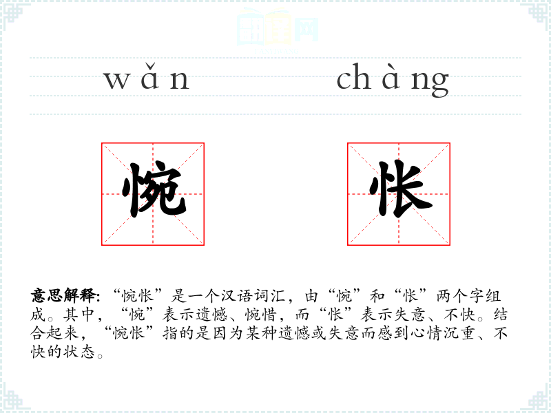 - 喜悦:表示心情愉快,与“惋怅”的沉重和不快形成鲜明对比。