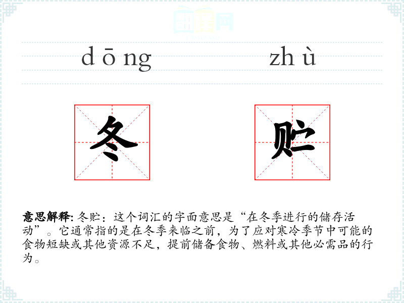 冬贮:这个词汇的字面意思是“在冬季进行的储存活动”。它通常指的是在冬季来临之前,为了应对寒冷季节中可能的食物短缺或其他资源不足,提前储备食物、燃料或其他必需品的行为。
