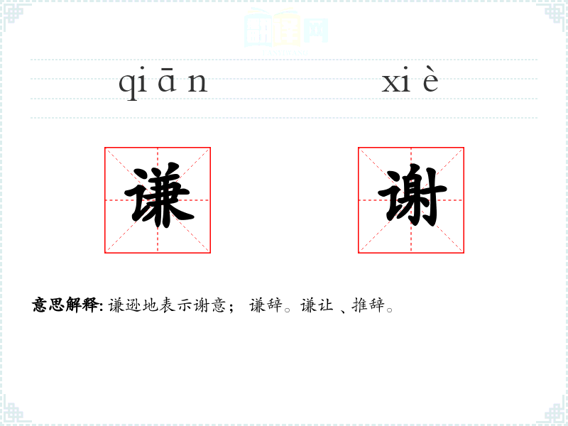 谦逊地表示谢意; 谦辞。谦让﹑推辞。