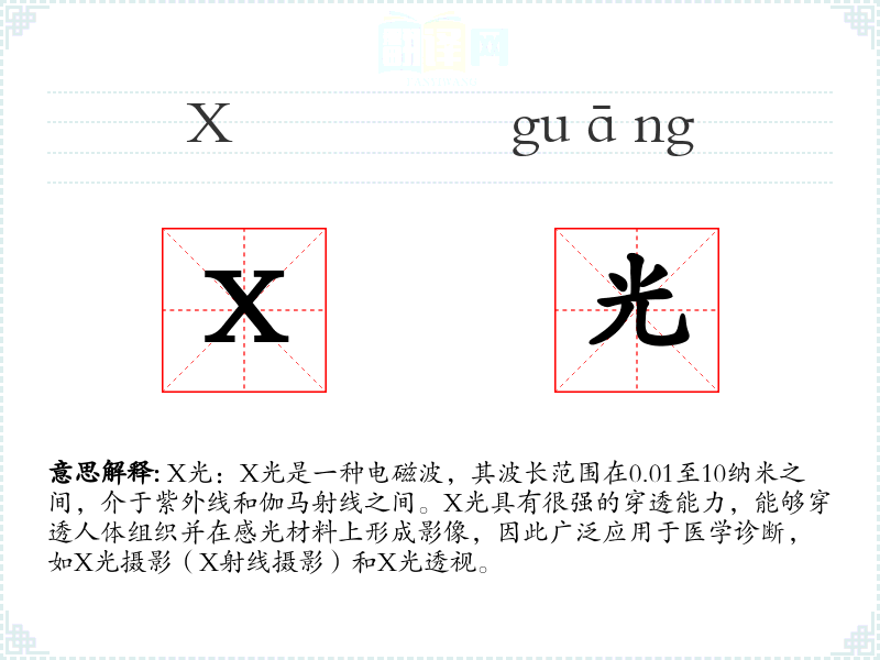 X光(X-ray)一词源自其发现者威廉·康拉德·伦琴(Wilhelm Conrad Röntgen)在1**5年发现这种射线时,因其性质未知而暂时命名为“X”,意为未知。随着科学的发展,X光在医学和工业领域的应用逐渐普及。
