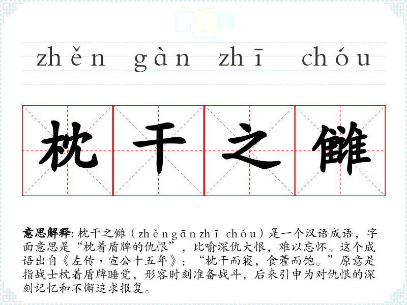 枕干之雠(zhěn gān zhī chóu)是一个汉语成语,字面意思是“枕着盾牌的仇恨”,比喻深仇大恨,难以忘怀。这个成语出自《左传·宣公十五年》:“枕干而寝,食藿而饱。”原意是指战士枕着盾牌睡觉,形容时刻准备战斗,后来引申为对仇恨的深刻记忆和不懈追求报复。