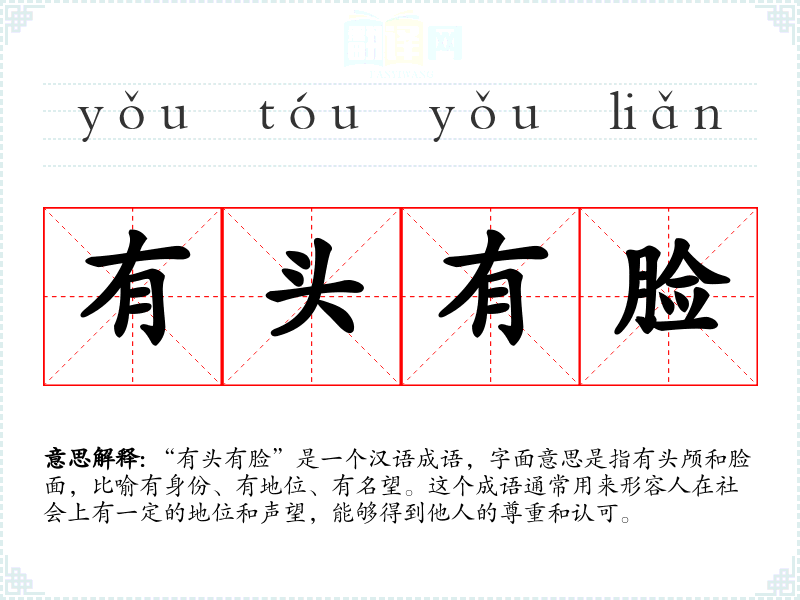“有头有脸”是一个汉语成语,字面意思是指有头颅和脸面,比喻有身份、有地位、有名望。这个成语通常用来形容人在社会上有一定的地位和声望,能够得到他人的尊重和认可。