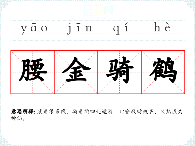 装着很多钱,骑着鹤四处遨游。比喻钱财极多,又想成为神仙。