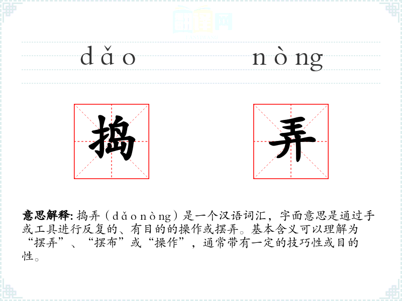 捣弄(dǎo nòng)是一个汉语词汇,字面意思是通过手或工具进行反复的、有目的的操作或摆弄。基本含义可以理解为“摆弄”、“摆布”或“操作”,通常带有一定的技巧性或目的性。