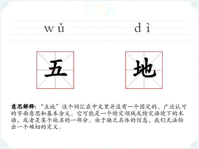 “五地”这个词汇在中文里并没有一个固定的、广泛认可的字面意思和基本含义。它可能是一个特定领域或特定语境下的术语,或者是某个地名的一部分。由于缺乏具体的信息,我们无法给出一个确切的定义。