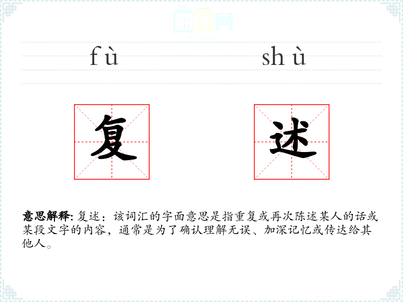 复述:该词汇的字面意思是指重复或再次陈述某人的话或某段文字的内容,通常是为了确认理解无误、加深记忆或传达给其他人。