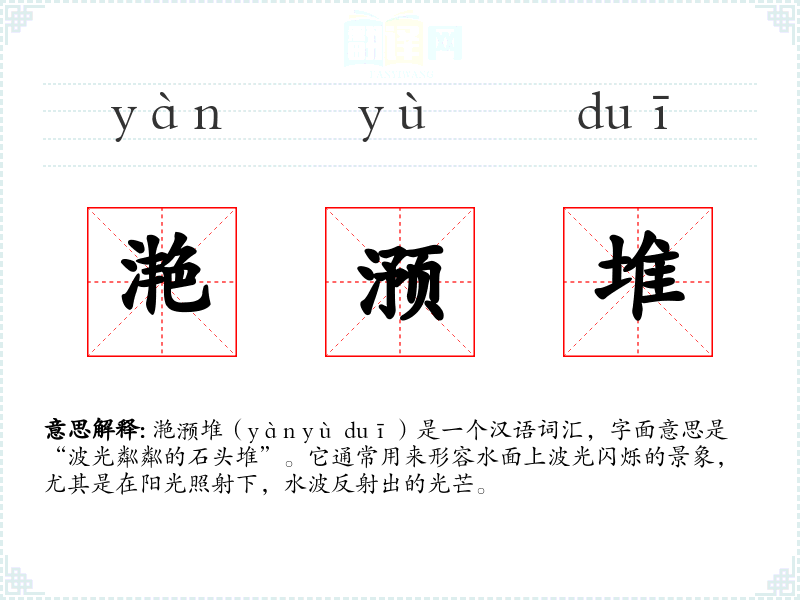 滟滪堆(yàn yù duī)是一个汉语词汇,字面意思是“波光粼粼的石头堆”。它通常用来形容水面上波光闪烁的景象,尤其是在阳光照射下,水波反射出的光芒。