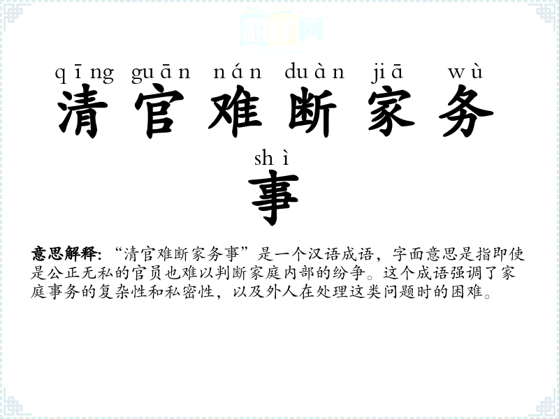“清官难断家务事”是一个汉语成语,字面意思是指即使是公正无私的官员也难以判断家庭内部的纷争。这个成语强调了家庭事务的复杂性和私密性,以及外人在处理这类问题时的困难。
