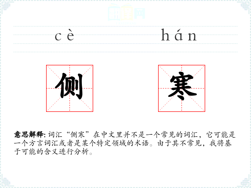 词汇“侧寒”在中文里并不是一个常见的词汇,它可能是一个方言词汇或者是某个特定领域的术语。由于其不常见,我将基于可能的含义进行分析。