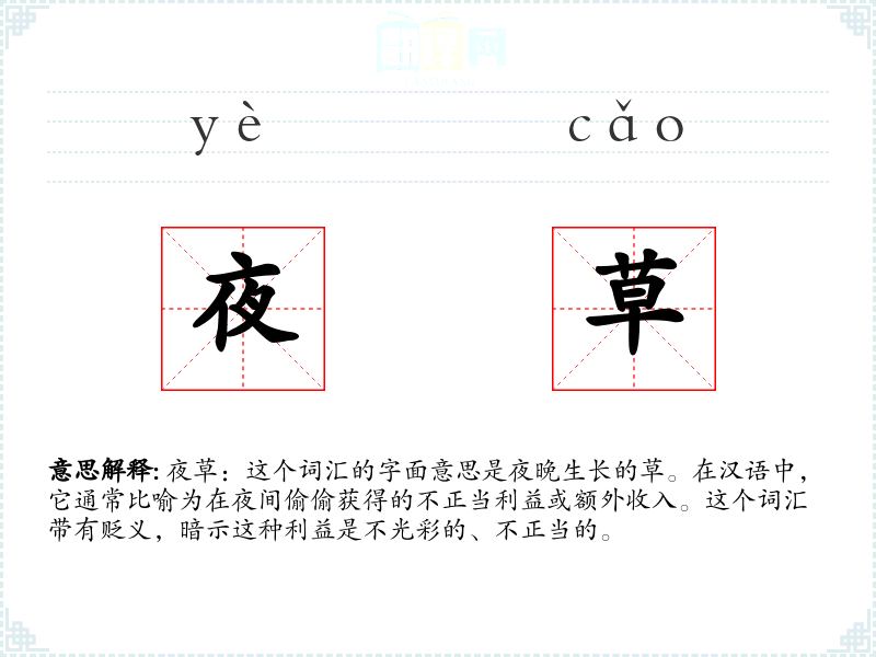 夜草:这个词汇的字面意思是夜晚生长的草。在汉语中,它通常比喻为在夜间偷偷获得的不正当利益或额外收入。这个词汇带有贬义,暗示这种利益是不光彩的、不正当的。