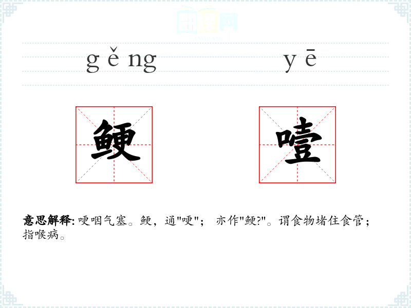 哽咽气塞。鲠,通"哽"; 亦作"鲠?"。谓食物堵住食管; 指喉病。