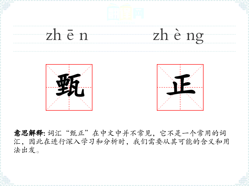 词汇“甄正”在中文中并不常见,它不是一个常用的词汇,因此在进行深入学*和分析时,我们需要从其可能的含义和用法出发。