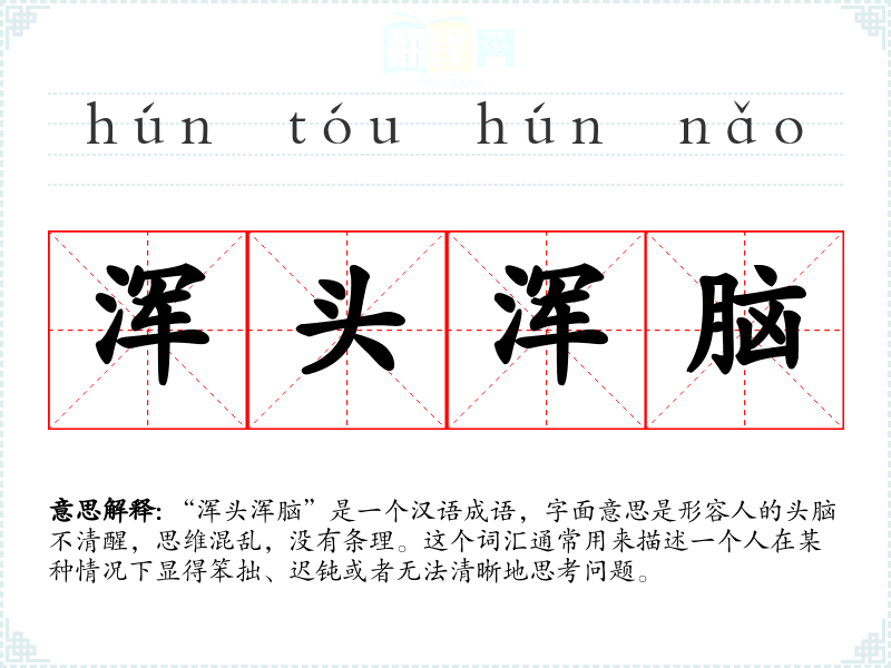 “浑头浑脑”是一个汉语成语,字面意思是形容人的头脑不清醒,思维混乱,没有条理。这个词汇通常用来描述一个人在某种情况下显得笨拙、迟钝或者无法清晰地思考问题。