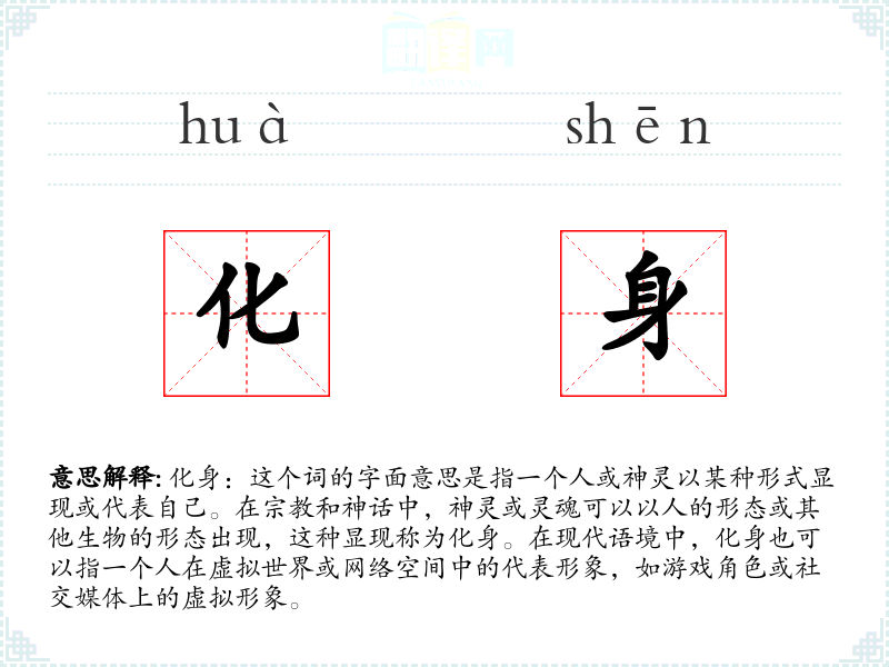 化身:这个词的字面意思是指一个人或神灵以某种形式显现或代表自己。在**和神话中,神灵或灵魂可以以人的形态或其他生物的形态出现,这种显现称为化身。在现代语境中,化身也可以指一个人在虚拟世界或网络空间中的代表形象,如游戏角色或社交媒体上的虚拟形象。