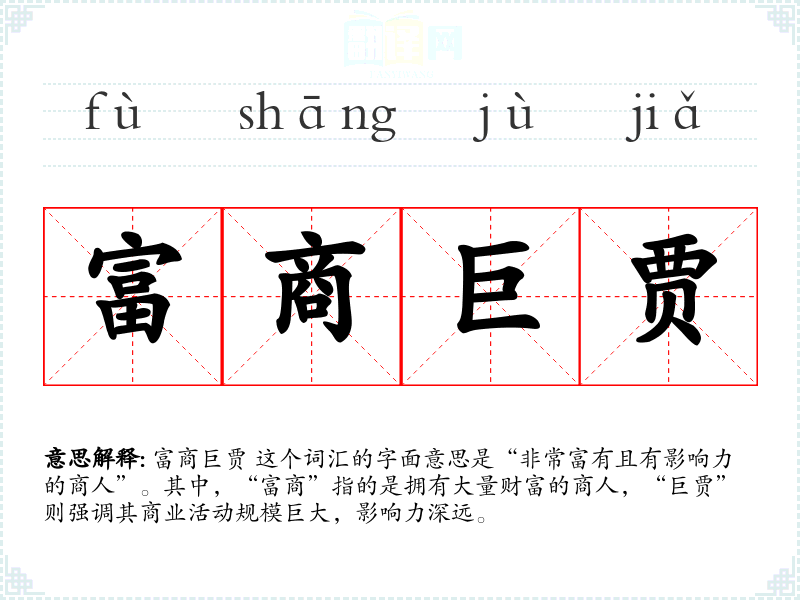 富商巨贾 这个词汇的字面意思是“非常富有且有影响力的商人”。其中,“富商”指的是拥有大量财富的商人,“巨贾”则强调其商业活动规模巨大,影响力深远。