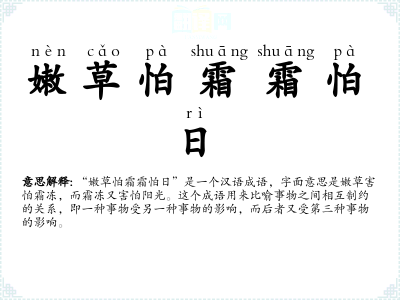 “嫩草怕霜霜怕日”是一个汉语成语,字面意思是嫩草害怕霜冻,而霜冻又害怕阳光。这个成语用来比喻事物之间相互制约的关系,即一种事物受另一种事物的影响,而后者又受第三种事物的影响。