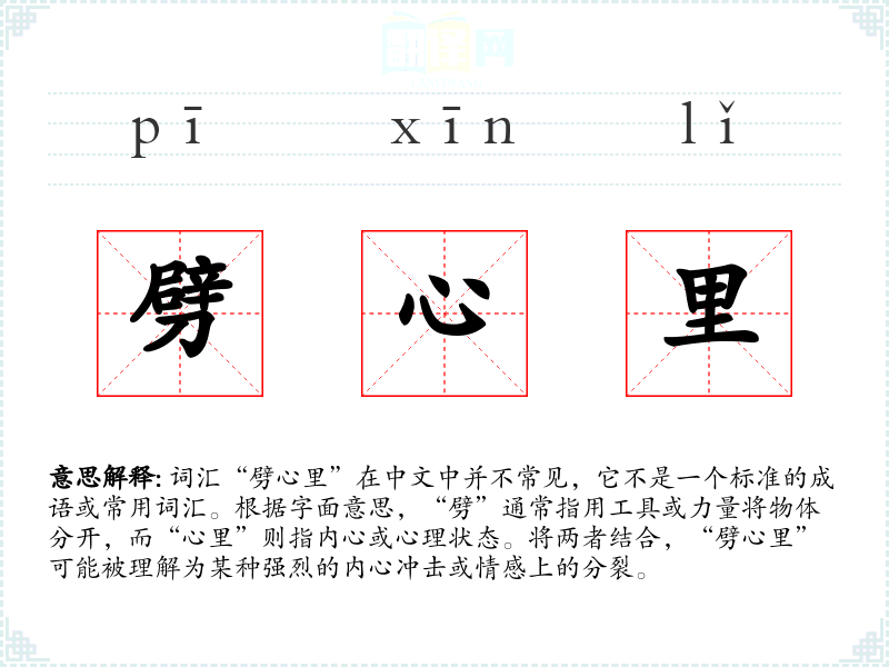 词汇“劈心里”在中文中并不常见,它不是一个标准的成语或常用词汇。根据字面意思,“劈”通常指用工具或力量将物体分开,而“心里”则指内心或心理状态。将两者结合,“劈心里”可能被理解为某种强烈的内心冲击或情感上的分裂。